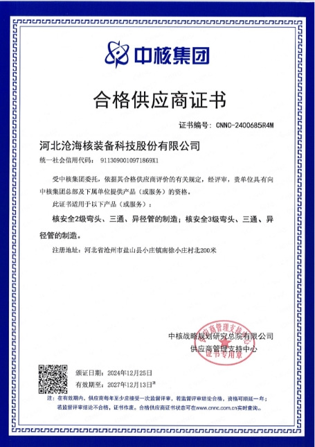 該合格供應(yīng)商證書的取得,是對河北滄海核裝備科技股份有限公司公司產(chǎn)品和綜合實(shí)力的肯定,標(biāo)志滄海核裝滿足核工業(yè)領(lǐng)域的相關(guān)要求。公司將以此為契機(jī),繼續(xù)堅(jiān)持創(chuàng)新驅(qū)動(dòng)發(fā)展,加強(qiáng)與中核集團(tuán)的合作力度,為國家核電工業(yè)的發(fā)展做出貢獻(xiàn)。